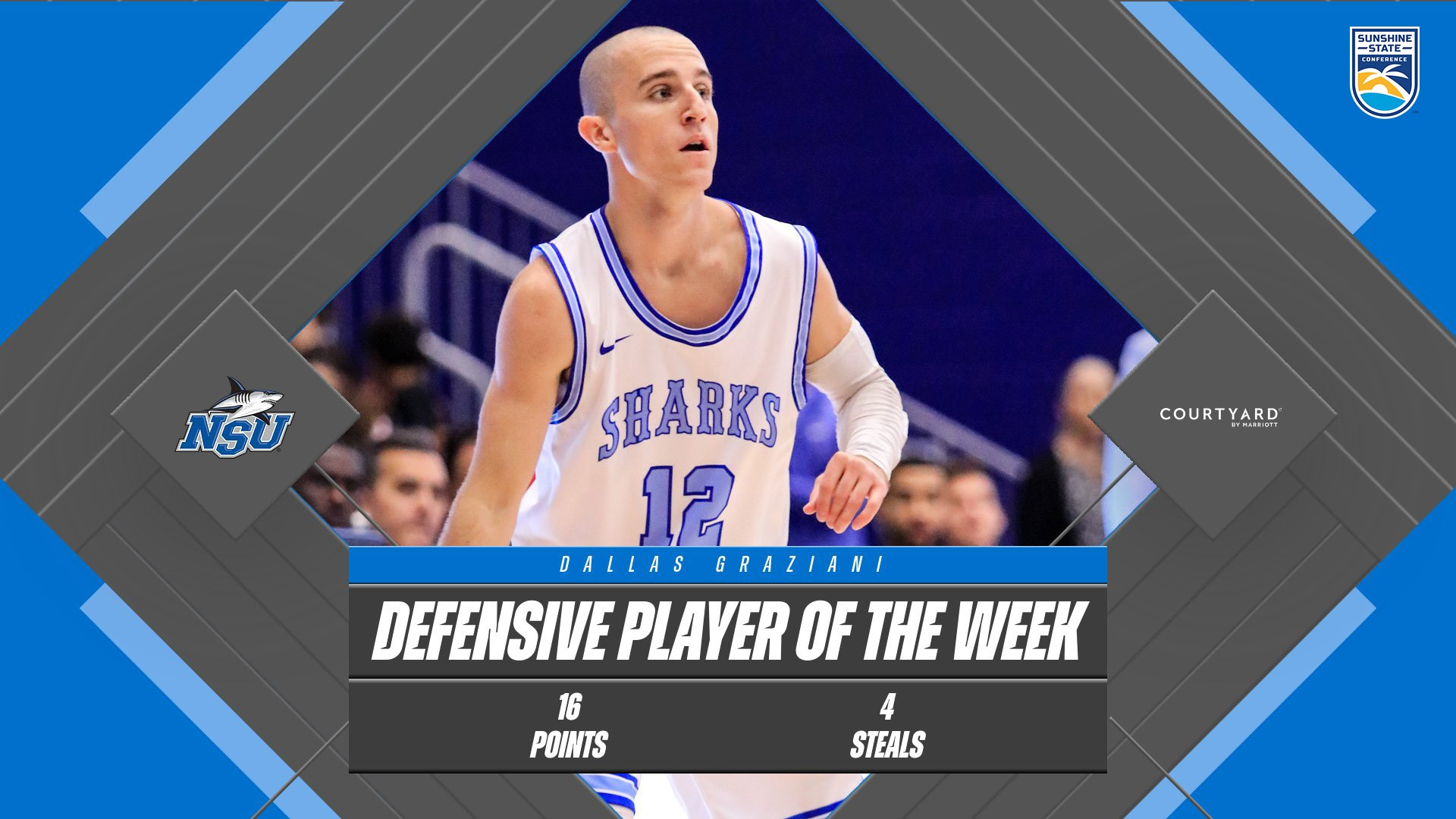 The Sunshine State Conference announced the Players of the Week for the week of November 28 – December 4, on Monday afternoon. Nova Southeastern Sharks student-athlete Dallas Graziani (Men’s Basketball) earned honors following his performance this past week.